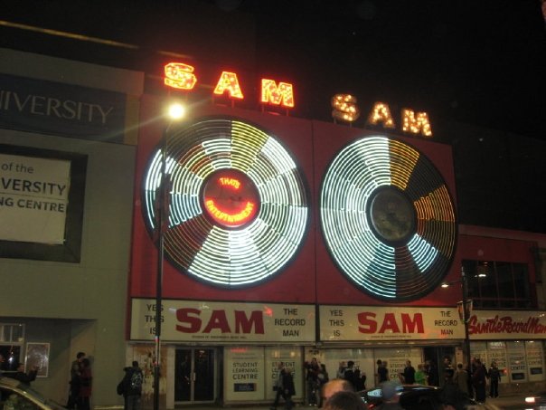 既に閉店したミュージック・ストアの看板がライトアップされていたり。