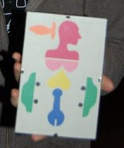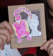 「ミニサイズなアート作品かグリーティングカードを持参してください。」