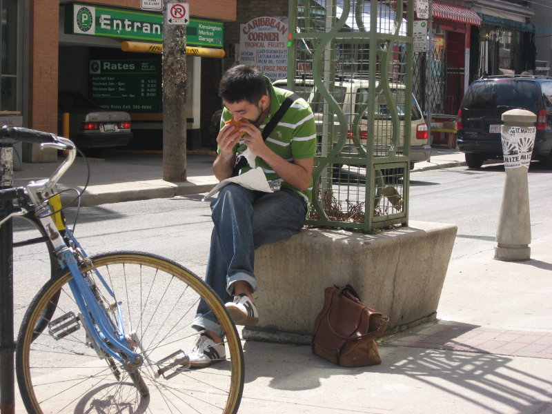 肉屋特製の肉厚でジューシーなハンバーガーを道端で頬張るあたし。