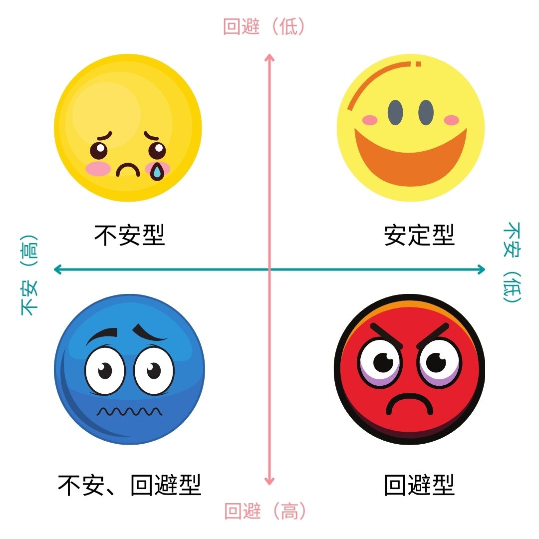 こうしてカテゴリーを作ってしまうと、血液型とか星座占いみたいにアタッチメント・スタイルをアイデンティティのように捉える人も出てくる。しかし、その考え方は危険だ。自分は不安型だから、嫉妬心や独占欲を感じて、常に拒絶されることを恐れてしまうのは仕方ない。そんな落とし穴にハマってしまうと、克服できる弱点を逆に強調してしまいかねない。「自分=不安型」ではなく、不安型の傾向にある自分は不信感を抱きやすいという風に見た方がいいのかもしれない。また、白黒ハッキリひとつの型にハマるわけではなくて、不安と回避の傾向から自分の位置を考えるべきである。自分の弱点をいかに乗り越えて、より安定したアタッチメント・スタイルに切り替えられるかが大事なのだ。