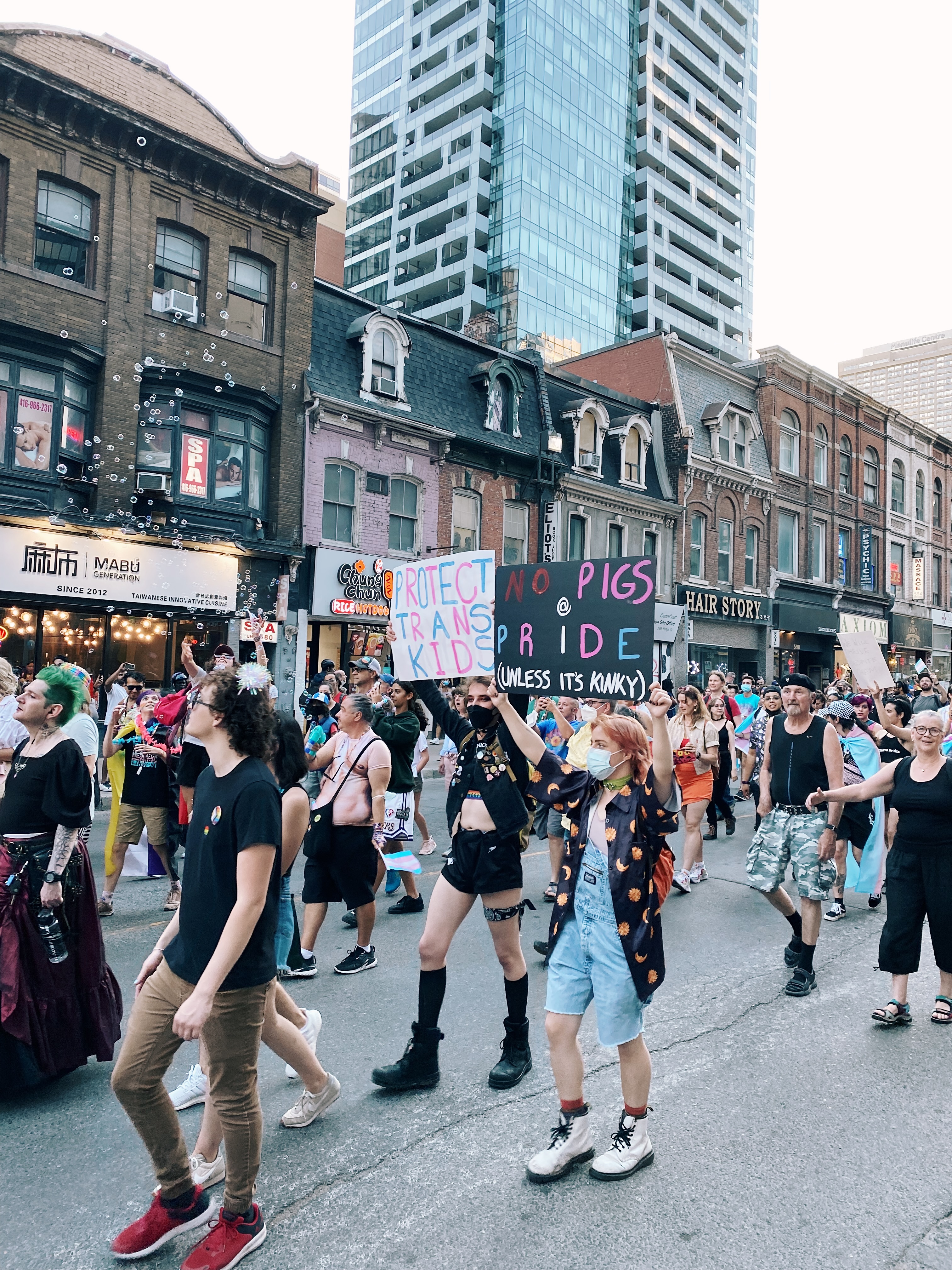 あたしの周りを見ても、プライドの楽しみ方はみんなバラバラである。ダンスイベントのチケットを買い揃えて毎晩朝まで踊るパーティ好きもいれば、ストリートフェアをぶらり歩いて買うもの買って帰宅する人もいる。キャシーみたいに、金曜日のトランスマーチ、土曜日のダイクマーチ、日曜日のプライドパレードに毎年欠かさずに参加する人もいる。今年の場合、アメリカ最高裁の中絶の権利に対する判決がプライドの直前だったため、ダイクマーチでは中絶の権利を支持する声が強かったし、マーチが終わった後そのまま抗議デモに参加した人も多かった。
